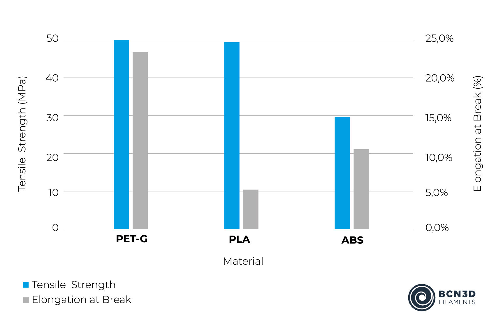 PET-G parts are as strong as those made with PLA but offer a better mechanical profile. PET-G is not brittle, which means that it will not snap abruptly if pulled or bended, on the contrary, it will progressively bend and stretch until reaching it maximum elongation limit of 23%.